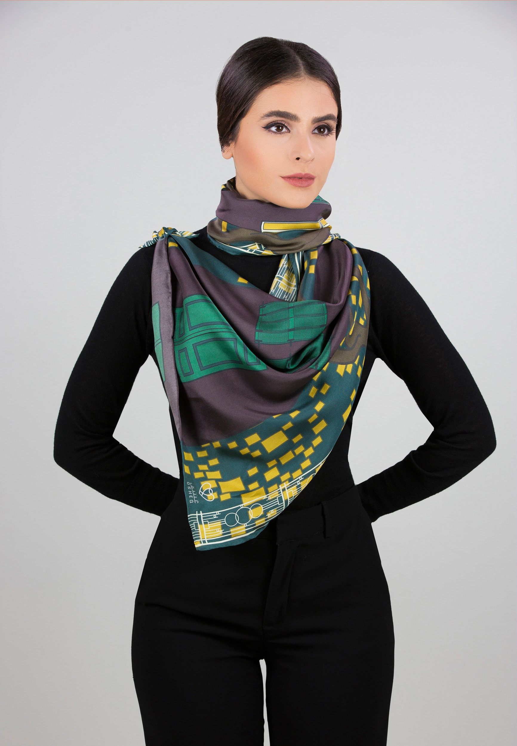 Presentation of the scarf. Photo courtesy of Osheq. Model: Michelle Shakhtoura